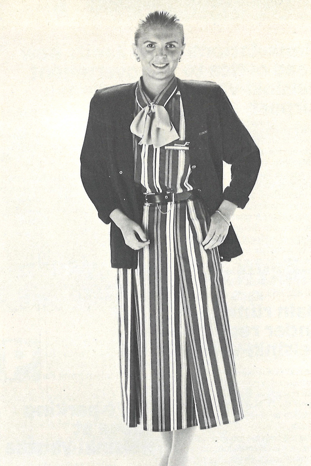 Finnair Oy:n punasinivalko-raidallinen kesävirkapuku vuodelta 1987 on kasarimuodin helmi. Heti virkapuvun julkistuksen yhteydessä matkailuaiheinen kolumni kommentoi HS:ssa puvun trikolori-värityksen yhdistävän miehistön enemmän Ranskaan tai Englantiin kuin Suomeen.