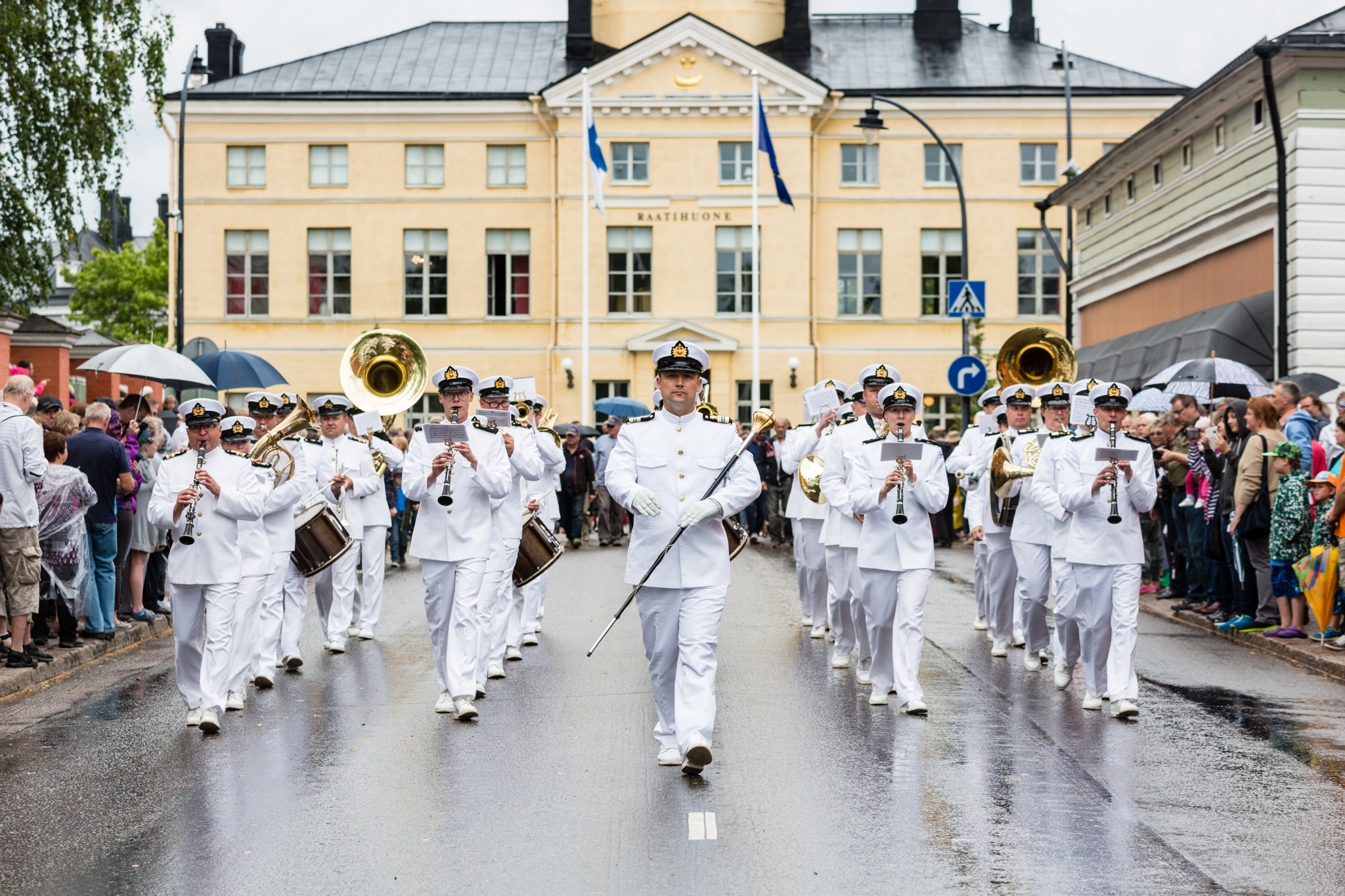 Valkoisen hellepuvun voi ehkä parhaiten bongata Laivaston soittokunnan yllä kesäajan konserteissa.