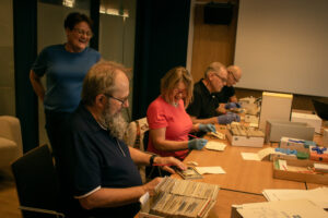 Kuva. Postimuseon näyttelypäällikkö Suvi Jalli ja vapaaehtoisia pöydän ääressä postikorttikokoelmaa järjestämässä. Kuva: Julia Riitijoki.